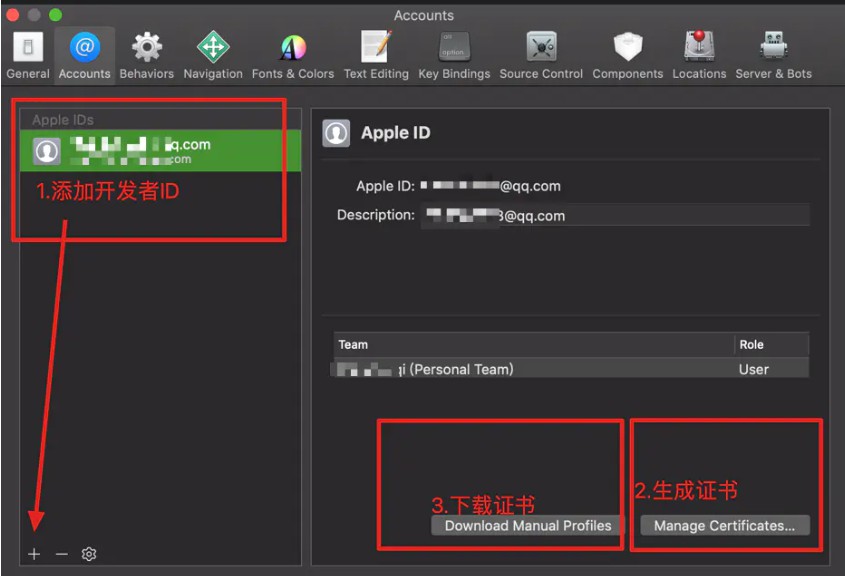 打开【Xcode】 -> 【Preferences】 -> 【Account】。添加 AppleId