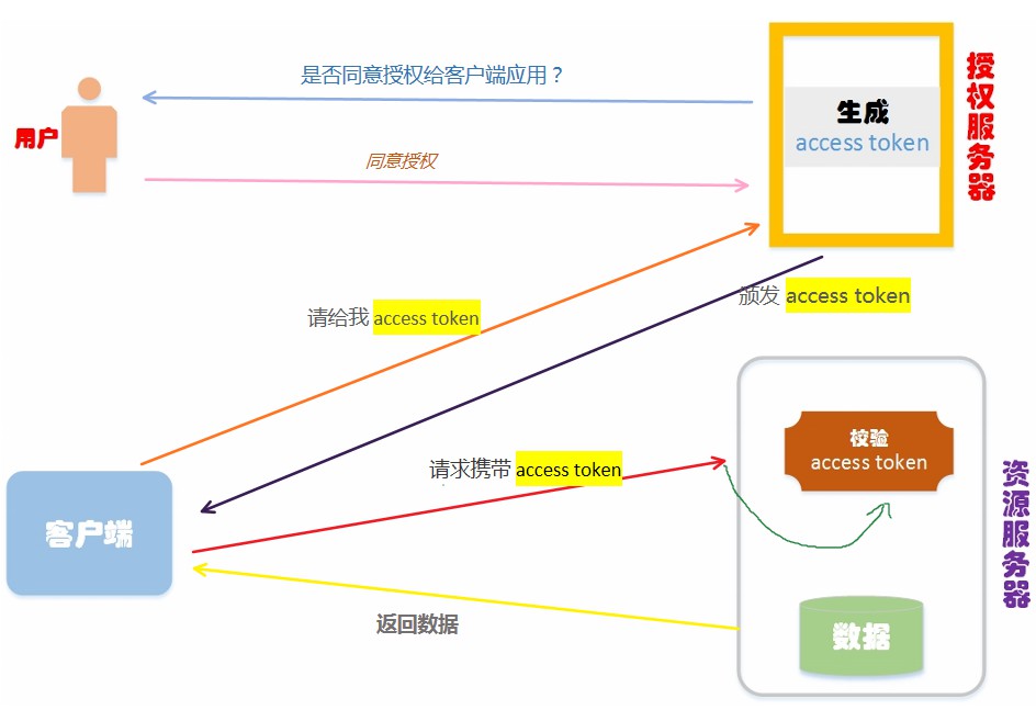 - Resource Server:资源服务器,拥有被访问资源的服务器,需要通过token来确定是否有权限访问