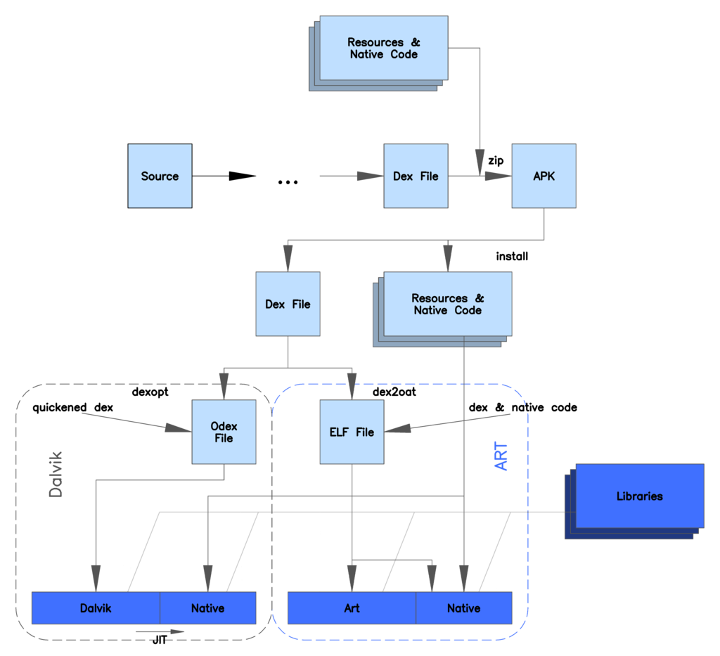 在使用ART的设备上安装一个Apk应用程序,首先需要使用dex2oat工具进行编译,编译后产生ELF可执行文件,当启动应用时从该ELF文件中运行;因此,ART消除了与Dalvik的解释和基于跟踪的JIT编译相关的各种应用程序执行开销。但作为一个缺点,ART在安装应用程序时需要额外的时间进行编译,导致安装APP需要更长时间,而且应用程序会占用更大的存储空间(通常是闪存)来存储编译后的代码。