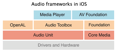 如图所示,在iOS平台上,所有的音频框架底层都是基于AudioUnit实现的。较高层次的音频框架包括:MediaPlayer、AVFoundation、OpenAL和AudioToolBox,这些框架都封装了AudioUnit,为特定的任务提供专用且简化的 API。