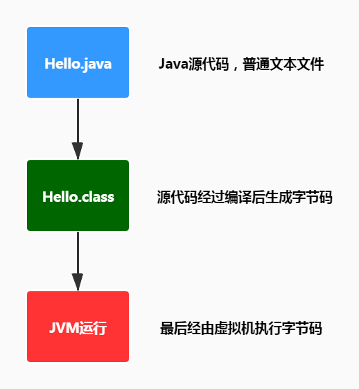 此时目录下产生一个Hello.class的字节码文件(字节码文件后缀为.class),执行运行命令,JVM则加载并运行Hello.class字节码